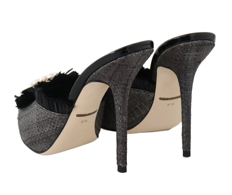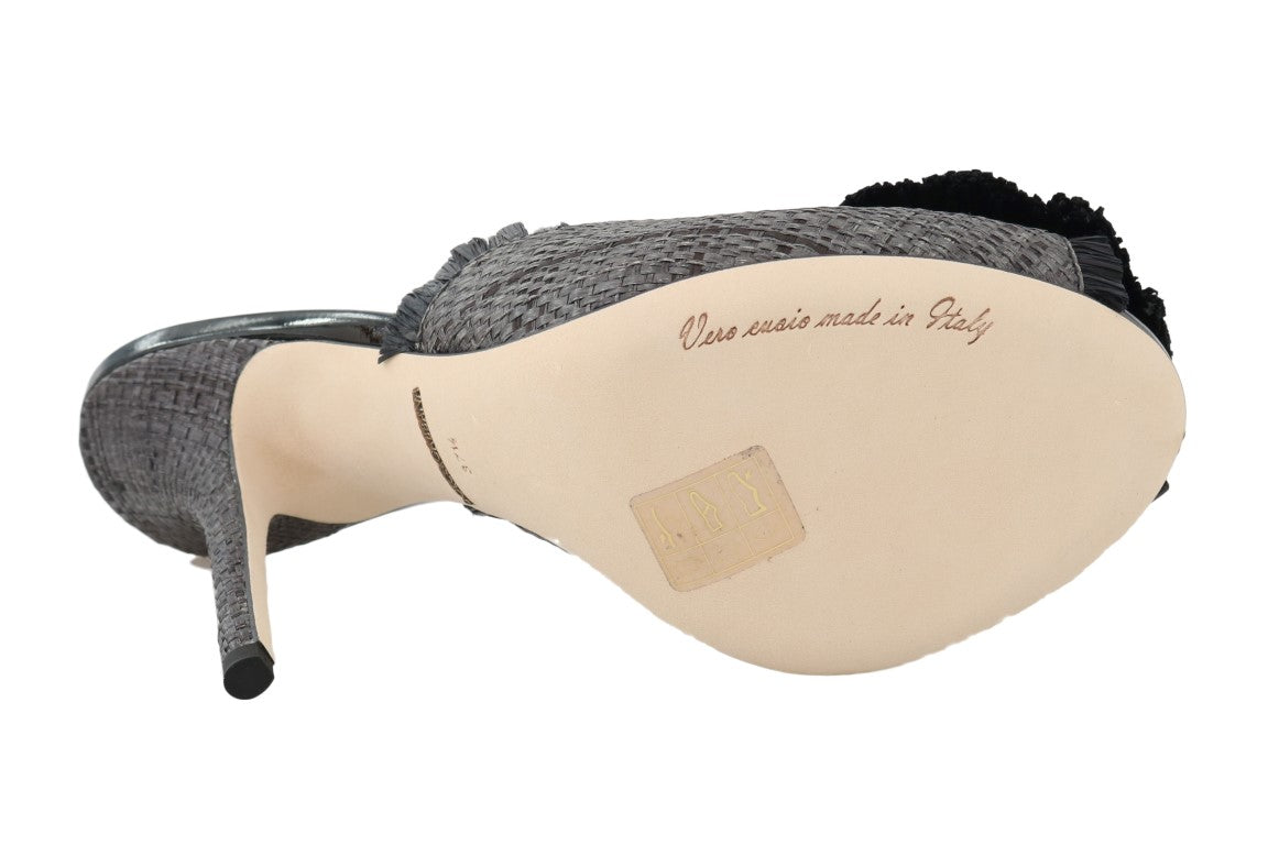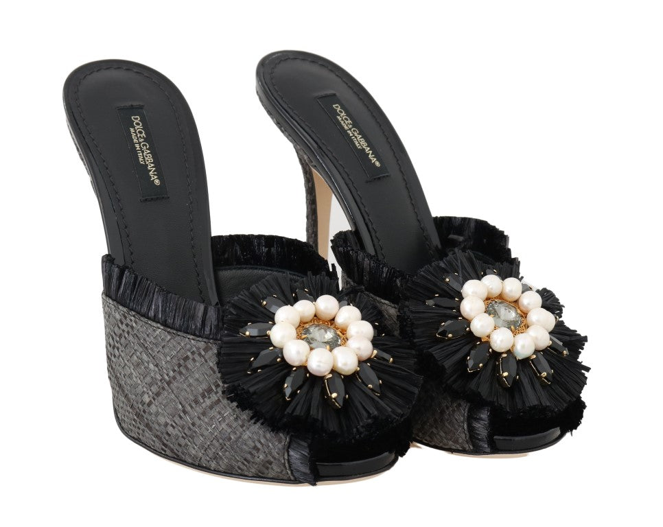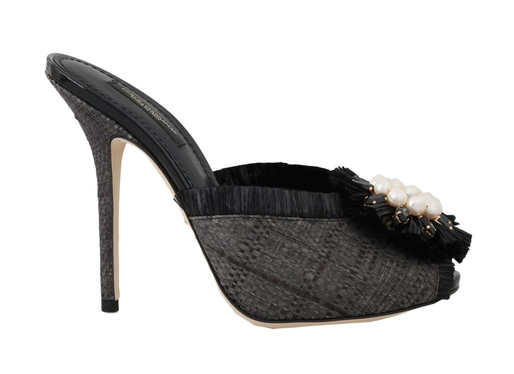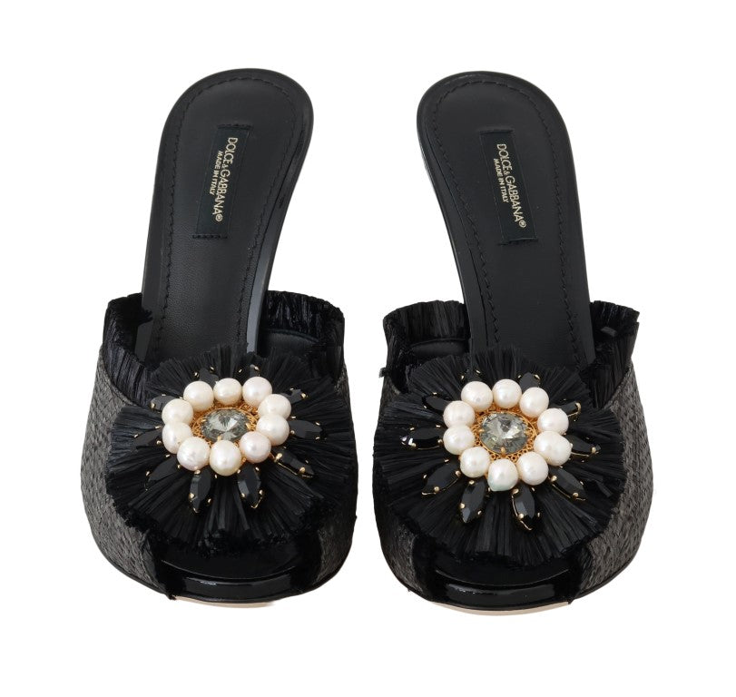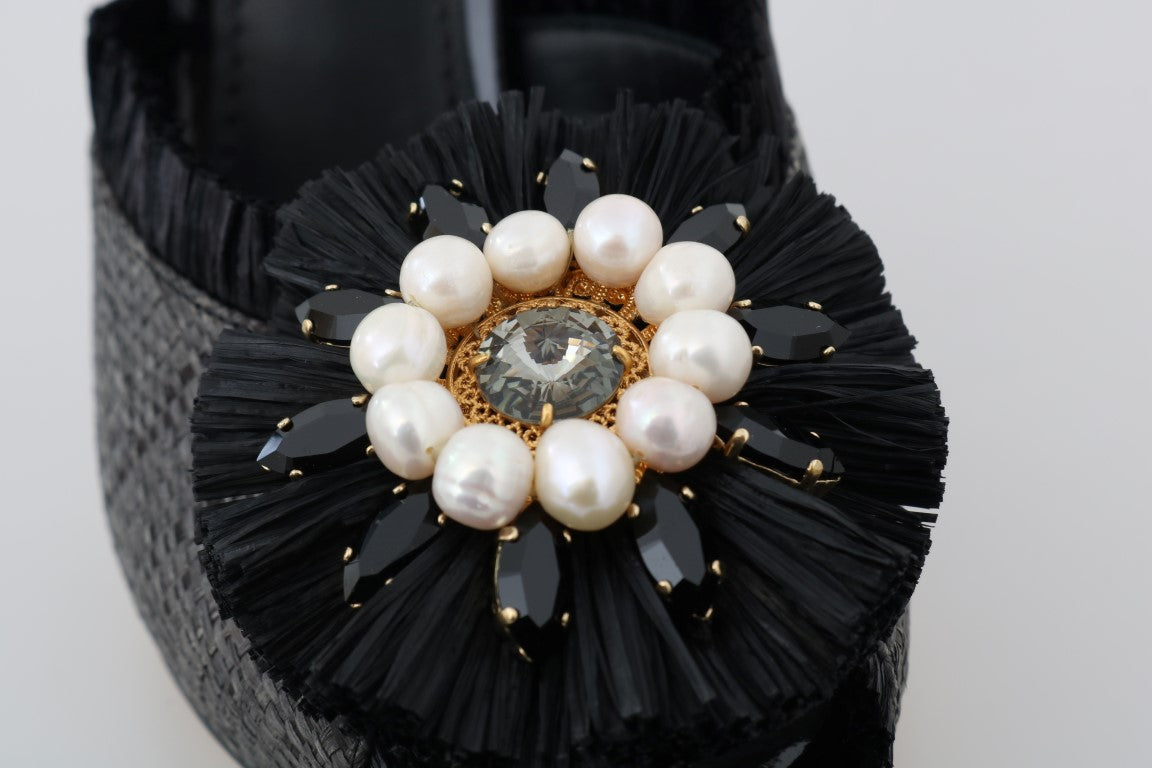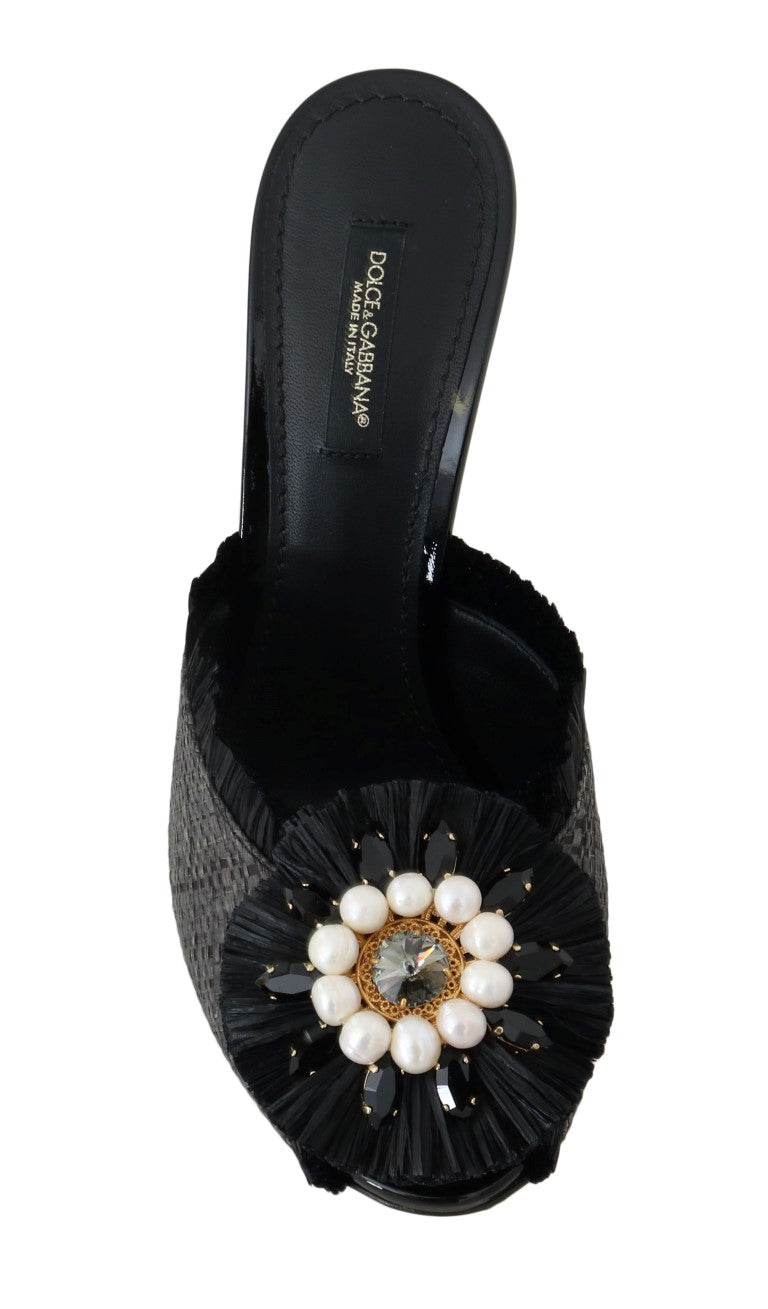 Black Straw Open Toes Crystal Sandals