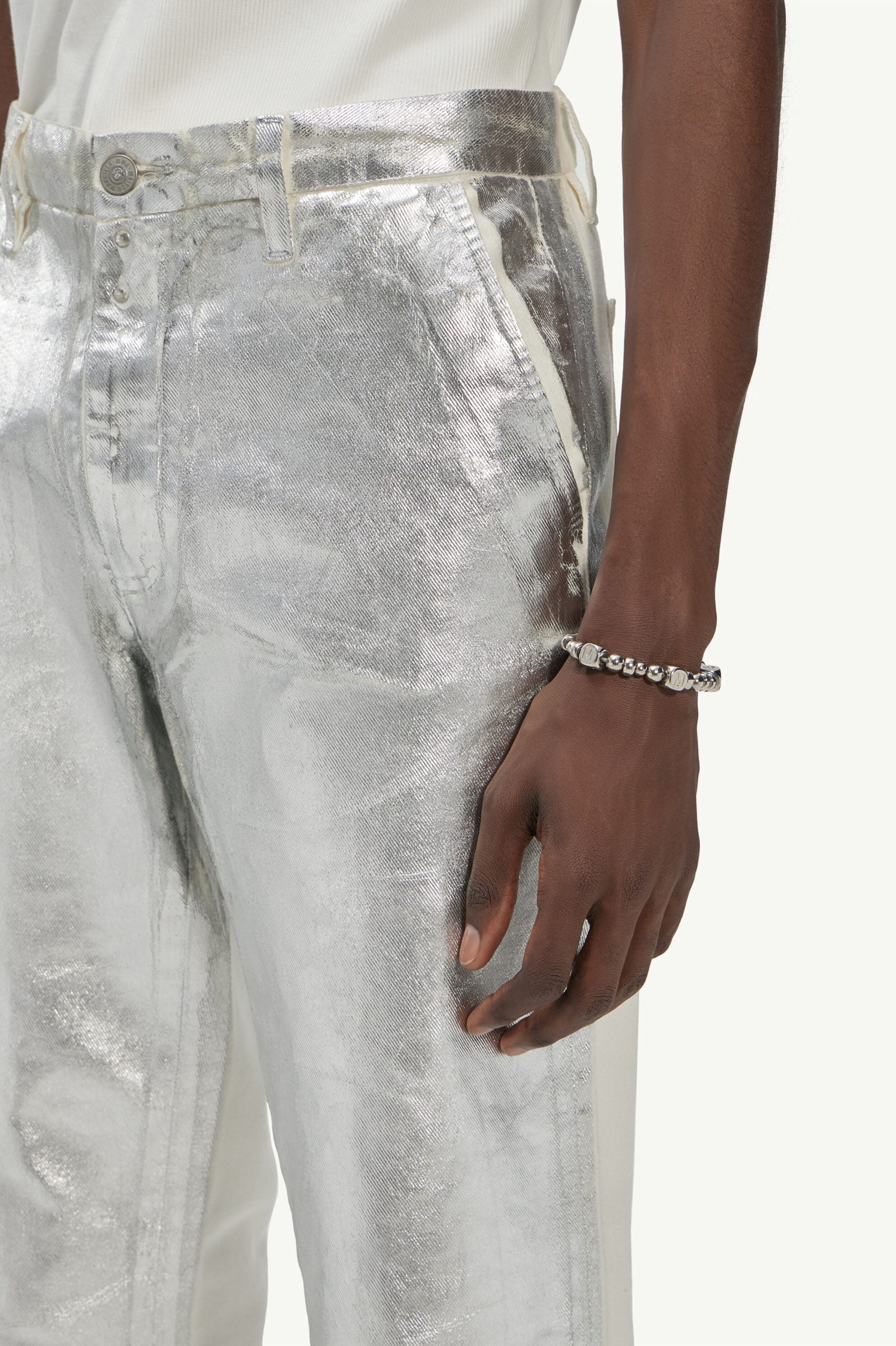 Indulge in the epitome of high-end fashion with these MAISON MARGIELA RTW pants. Embodying a bold fusion of sophistication and avant-garde style, these pants are an absolute must-have for the trendsetting individual. Crafted in Italy, the land of sartorial heritage, these pants boast a striking WHITE/SILVER colorway that will make a statement with every stride. Complete your poised ensemble with this unrivaled piece.